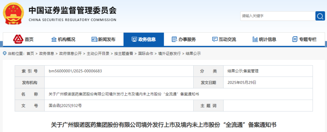 银诺医药-B,获境外发行上市备案通知书。近日,中国证监会国际司发布《关于广州银诺医药集团股份有限公司境外发行上市及境内未上市股份“全流通”备案通知书》(国合函[2025]932号)。